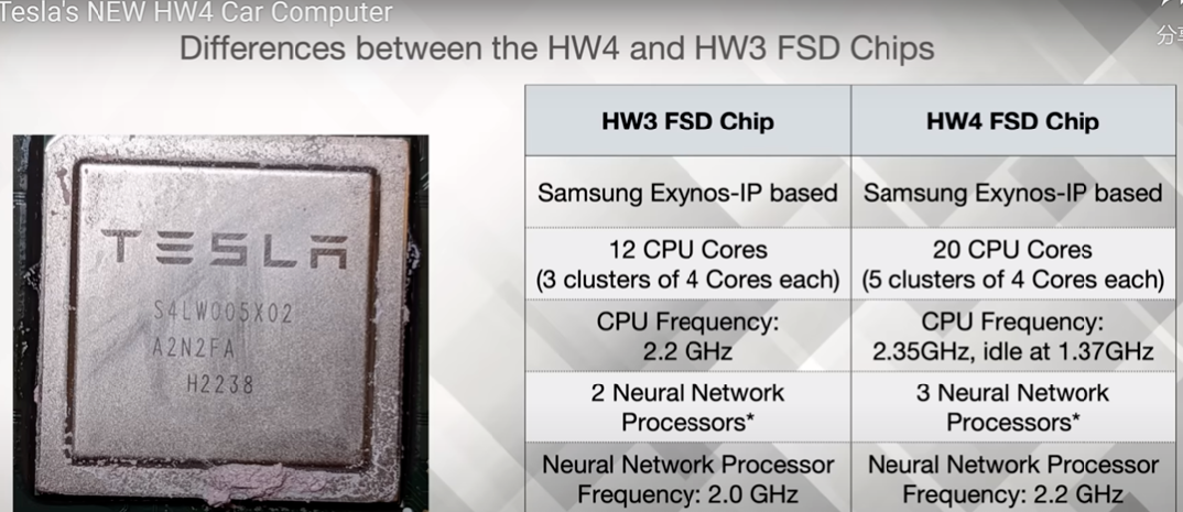 第一代FSD使用的是三星的14納米工藝。根據(jù)WikiChip的數(shù)據(jù),三星7納米LPP HD高密度cell方案的晶體管密度高達95.08 MTr/mm2,而HP高性能方案的晶體管密度為77.01 MTr/mm2。相比之下,三星14納米UHP方案的晶體管密度為26.22 MTr/mm2,HP方案晶體管密度為32.94 MTr/mm2。基本上,三星7納米的晶體管密度是14納米的3倍以上。這意味著特斯拉的第二代FSD芯片可以容納更多的MAC陣列,從而實現(xiàn)AI性能的三倍提升。考慮到第一代FSD的AI性能為73.7TOPS@INT8,三倍的提升即為221.1TOPS。如果再結(jié)合稀疏模型加速技術,算力數(shù)字還可以再增長一倍。另外,根據(jù)推測,由于二代FSD芯片面積明顯大于一代,并且NPU增加到3個,因此其算力可能在500TOPS上下。